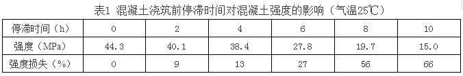 (6)在初凝時間內(nèi)的混凝土,由于氣溫較高、運距較遠、壓車時間較長等造成混凝土坍落度損失較大,可通過試驗添加同型號的泵送劑或減水劑,但添加與原先已加的總和摻量不能超過外加劑最大摻量的20%。應(yīng)逐漸添加,先少加,摻入后,攪拌運輸車必須快速轉(zhuǎn)動2min左右,測定坍落度符合要求。運到現(xiàn)場的混凝土不能立即卸料,應(yīng)快速轉(zhuǎn)動運輸車2min后卸料,以確保坍落度和質(zhì)量。對超過初凝時間的混凝土應(yīng)廢棄,不能再使用。混凝土澆筑前停滯的時間越長,混凝土強度損失越嚴(yán)重(如表1),應(yīng)當(dāng)引起足夠重視。