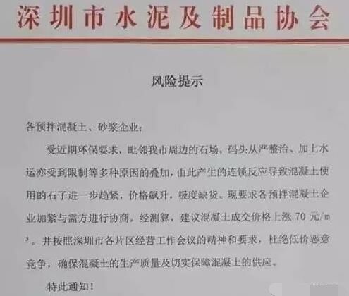 調(diào)價(jià)函表示,近段時(shí)間,受毗鄰周邊石場,碼頭管治,加上水運(yùn)受到一定限制等多種因素影響,導(dǎo)致珠三角周邊地區(qū)礫石極度緊缺直接影響價(jià)格成本上漲,造成混凝土生產(chǎn)直接成本增加70元/立方以上,混凝土公司已無力承擔(dān)由于原材料價(jià)格急劇上漲造成的巨額虧損,為確保混凝土的正常供應(yīng),從2016年12月13日起,在實(shí)際結(jié)算價(jià)的基礎(chǔ)上上調(diào)70元/立方(以C30為準(zhǔn),其他等級同比調(diào)整)。