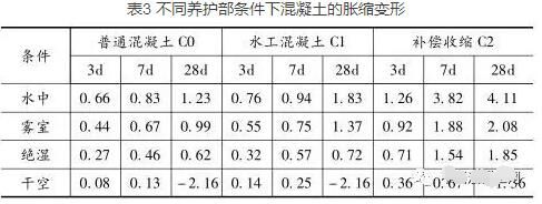 脹縮變形是混凝土的一項重要性質(zhì),不同的濕度條件和水分會對混凝土的脹縮變形造成不同的影響。我們通過不同的養(yǎng)護條件所造成的結(jié)果不同的現(xiàn)象,來探究濕度和水分對混凝土脹縮變形的影響(見表3)。