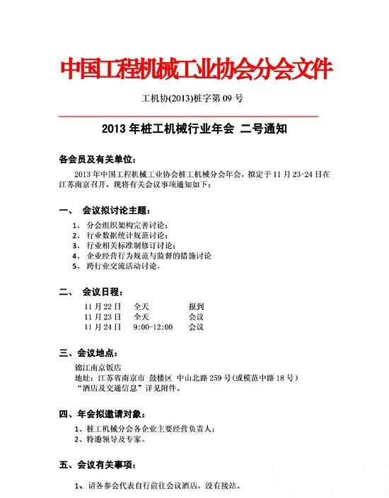 摘要:2013年中國(guó)工程機(jī)械工業(yè)協(xié)會(huì)樁工機(jī)械分會(huì)年會(huì),將于11月23—24在江蘇南京錦江南京飯店召開。