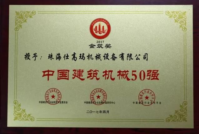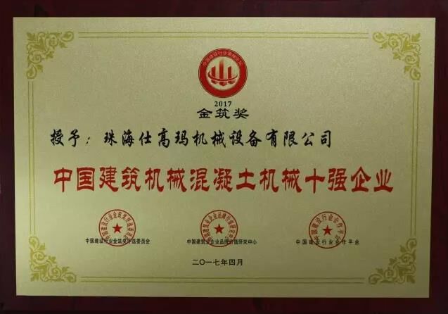 近日,“2017中國建設行業(yè)領袖峰會”暨2016年度“金筑獎”頒獎盛典在北京召開,珠海仕高瑪機械設備有限公司在2016年全國建筑業(yè)“金筑獎”評選活動中,榮獲“中國建筑機械50強”、“中國建筑機械混凝土機械十強企業(yè)”稱號。
