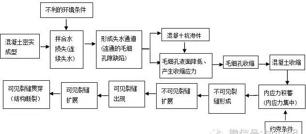 作者在攪拌站成立之初的抗裂實踐中,對這些現(xiàn)象也深感困惑。直到后來明確了早期裂縫是因為混凝土失水過多所致,并對這一機(jī)理進(jìn)行了深入研究,才重新認(rèn)識了混凝土收縮裂縫形成的全過程,如圖1[5]所示。