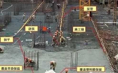 6、大體積泵送混凝土經(jīng)振搗后表面水泥漿較厚,容易引起表面裂縫。首先,要求在振搗最上一層混凝土時,控制振搗時間,注意避免表層產(chǎn)生太厚的浮漿層;在澆搗后,必須及時用2m 長括尺,將多余浮漿層刮除,按照標高控制點,將混凝土表面括拍平整。有凹坑的部位必須用混凝土填平,在混凝土收漿接近初凝時,混凝土面進行二次抹光,用木蟹全面仔細打抹兩遍,既要確?;炷恋钠秸?,又要把其初期表面的收縮脫水細縫閉合,在混凝土收漿凝固施工期間,除了具體施工人員外,不得在未干硬的混凝土面上隨意行走,收漿工作完成的面必須同步及時覆蓋薄膜。