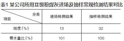 優(yōu)質(zhì)的粉煤灰摻入混凝土可明顯地改善混凝土的和易性,當(dāng)粉煤灰摻量大于膠材總量的5%~10%時(shí),效果極為明顯?,F(xiàn)今在混凝土實(shí)際生產(chǎn)中,粉煤灰摻量往往達(dá)到20%,有的甚至高達(dá)30%,但混凝土的和易性卻不盡人意。抽取原材料進(jìn)行檢測(cè)時(shí),發(fā)現(xiàn)粉煤灰的檢測(cè)結(jié)果經(jīng)常不滿足標(biāo)準(zhǔn)要求或者與驗(yàn)收時(shí)的結(jié)果相差甚遠(yuǎn)?,F(xiàn)以某公司所用Ⅱ級(jí)粉煤灰進(jìn)場及抽樣常規(guī)檢測(cè)結(jié)果進(jìn)行對(duì)比,見表1。
