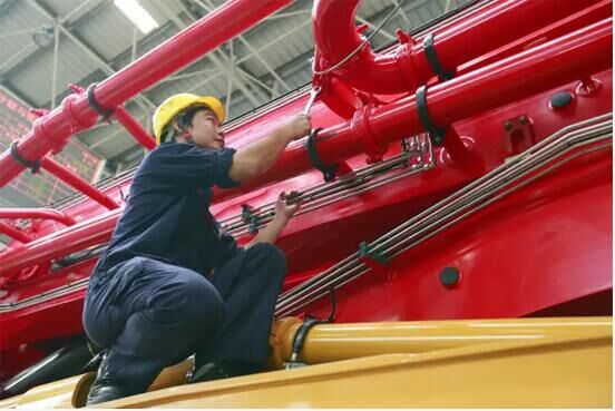 由于泵車生產(chǎn)線是高度柔性化的生產(chǎn),產(chǎn)品型號有37米、49米、56米、66米、86米等幾十種型號,還要滿足客戶的各種定制化需求,這就要求工人們在熟練掌握每一款產(chǎn)品的標準化作業(yè)同時,牢記每一顆螺母、每一根膠管、每一個閥塊的正確安裝方法,對泵車制造工藝做到了然于心,用最快的速度保證每一臺泵車的順利下線。