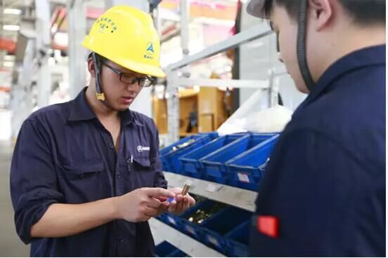 奉俊翔今年剛滿28歲,別看年紀不大,卻是一個地地道道的三一“老人”,入司八年以來,奉俊翔已經(jīng)帶出了8名徒弟。如奉俊翔這樣的“80后”技術(shù)骨干在泵車裝配班還有很多,他們已成為技術(shù)培訓和傳承“精益制造”的中堅力量。每天早會后,老員工們會將新人聚在一起,為新人工作中遇到的問題答疑解惑。這種“師帶徒”制度促進了年輕工人的成長,也加快了企業(yè)發(fā)展。