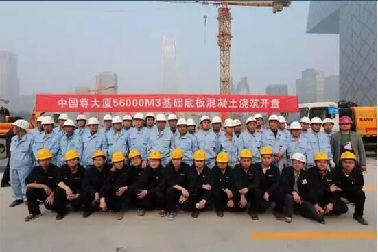 為了保障此次澆筑的順利完成,三一派出了20多名服務(wù)工程師駐守工地,保證每臺設(shè)備至少有一名服務(wù)工程師進(jìn)行專職服務(wù)。2014年4月27日,在18臺三一車載泵、20多臺三一攪拌車的全力保障下,“中國尊”項(xiàng)目完成了最大底板澆筑,將標(biāo)號60以上的高粘稠度混凝土一次性泵送到位。這次澆筑持續(xù)了96個(gè)小時(shí),一次性連續(xù)澆筑混凝土總量達(dá)5.6萬立方米,在連續(xù)澆筑期間,實(shí)現(xiàn)了零事故、零投訴,澆筑一次成優(yōu),創(chuàng)造了北京建筑業(yè)的新奇跡。