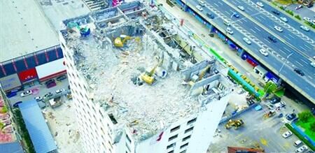 由于距居民樓和高架橋僅二三十米,明湖大酒店大樓未用爆破手段拆除,而是把挖掘機(jī)吊到18樓頂一層一層往下拆
