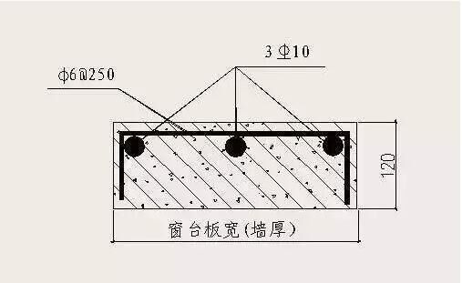 對于砌體墻,外窗洞下口必須澆筑寬與墻厚相同、高度不小于120mm、長度每邊伸入墻內(nèi)不少于400mm(不足400mm時(shí)通長設(shè)置)的混凝土窗臺(tái)板(針對窗臺(tái)下砌體八字縫措施),已設(shè)鋼筋混凝土凸窗套或窗臺(tái)板者除外。窗臺(tái)板為C20混凝土,內(nèi)配3Φ10主筋和φ6@250U型分布筋。