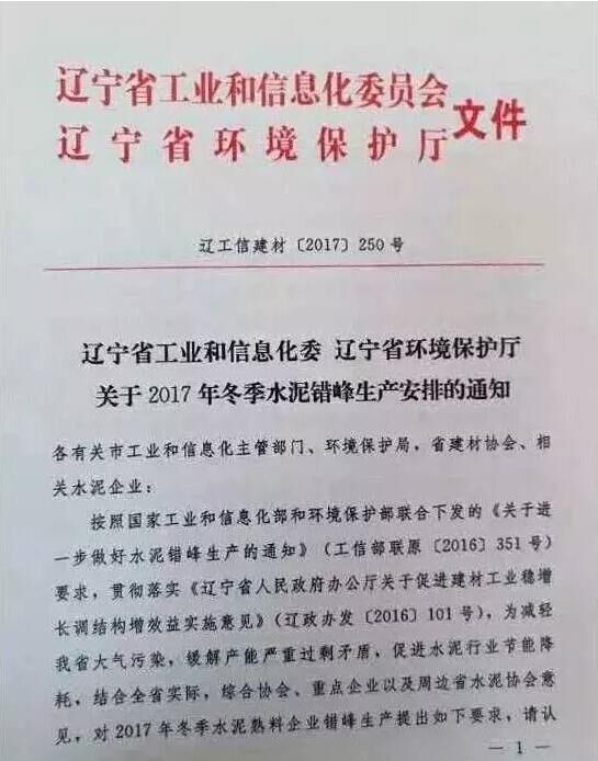 日前,遼寧省工信委和遼寧省環(huán)保廳聯(lián)合發(fā)文要求遼寧省水泥企業(yè)于今年11月開始啟動水泥行業(yè)采暖季錯峰停產(chǎn)計劃,除大連市以外的其他城市的全部水泥熟料生產(chǎn)企業(yè)錯峰停產(chǎn)6個月,錯峰生產(chǎn)自今年11月1日起停至明年春天4月末結(jié)束。