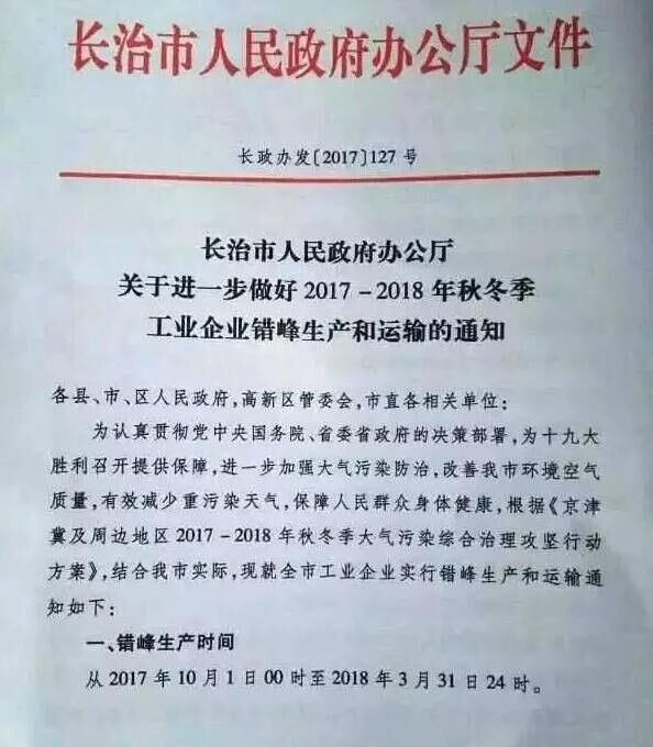 山西省長治市也發(fā)布《關(guān)于進(jìn)一步做好2017-2018秋冬季工業(yè)企業(yè)錯峰生產(chǎn)和運輸?shù)耐ㄖ?。要求?017年10月1日00時起至2018年3月31日24時,水泥(含粉磨站)等建材行業(yè)企業(yè)全部停產(chǎn)。
