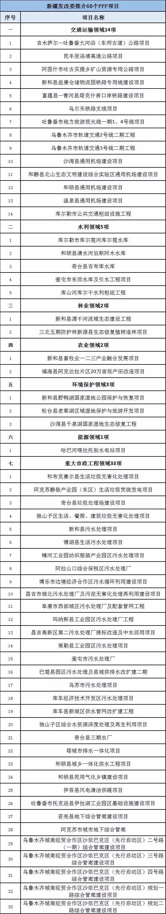 新疆維吾爾自治區(qū)發(fā)改委推介60個(gè)PPP項(xiàng)目,總投資559.12億元。包括:交通運(yùn)輸領(lǐng)域項(xiàng)目14項(xiàng),總投資368.2億元;水利領(lǐng)域項(xiàng)目5項(xiàng),總投資40.58億元;林業(yè)領(lǐng)域項(xiàng)目2項(xiàng),總投資4.6億元;農(nóng)業(yè)領(lǐng)域項(xiàng)目2項(xiàng),總投資5.3億元;環(huán)境保護(hù)領(lǐng)域項(xiàng)目3項(xiàng),總投資14.67億元;能源領(lǐng)域項(xiàng)目1項(xiàng),總投資20.2億元;重大市政工程領(lǐng)域項(xiàng)目33項(xiàng),總投資105.57億元。