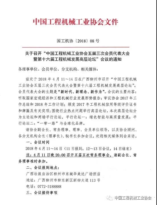 中國工程機(jī)械工業(yè)協(xié)會(huì)茲定于2018年4月11~14日在廣西柳州市召開“中國工程機(jī)械工業(yè)協(xié)會(huì)五屆三次會(huì)員代表大會(huì)暨第十六屆工程機(jī)械發(fā)展高層論壇”。會(huì)員代表大會(huì)的主題是“新時(shí)代、新理念、新作為”。