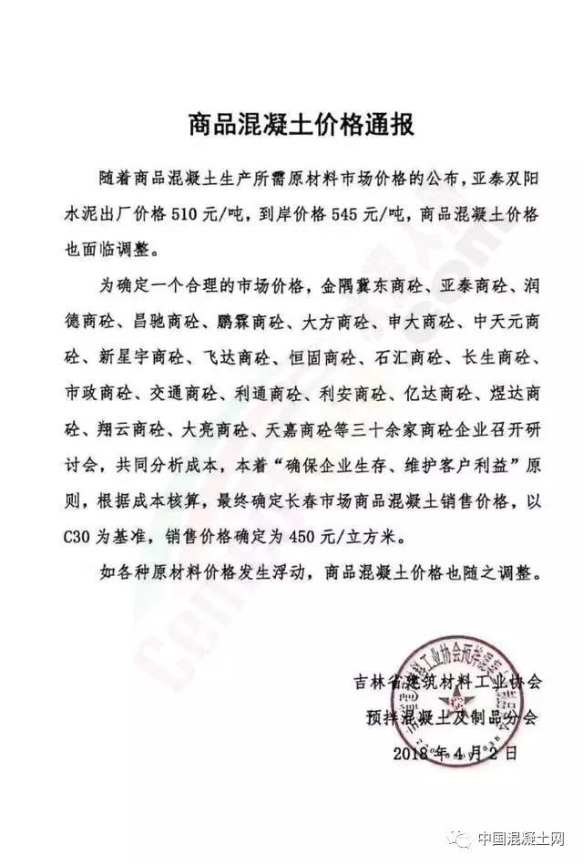 為確定一個(gè)合理的市場(chǎng)價(jià)格,金隅冀東商砼、亞泰商砼、潤(rùn)德商砼、昌馳商砼、鵬霖商砼、大方商砼、中天元商砼、新星宇商砼、飛達(dá)商砼、石匯商砼、長(zhǎng)生商砼、市政商砼、交通商砼、利通商砼、利安商砼、億達(dá)商砼、煜達(dá)商砼、翔云商砼、大亮商砼、天嘉商砼等三十余家商砼企業(yè)召開(kāi)研討會(huì),共同分析,本著“確保企業(yè)生存、維護(hù)客戶(hù)利益”原則,根據(jù)成本核算,最終確定長(zhǎng)春市場(chǎng)商品混凝土銷(xiāo)售價(jià)格,以C30為基準(zhǔn),銷(xiāo)售價(jià)格確定為450元/立方米。