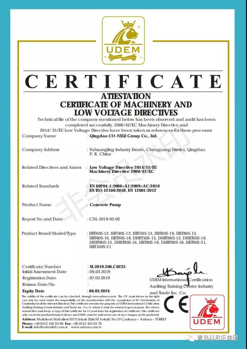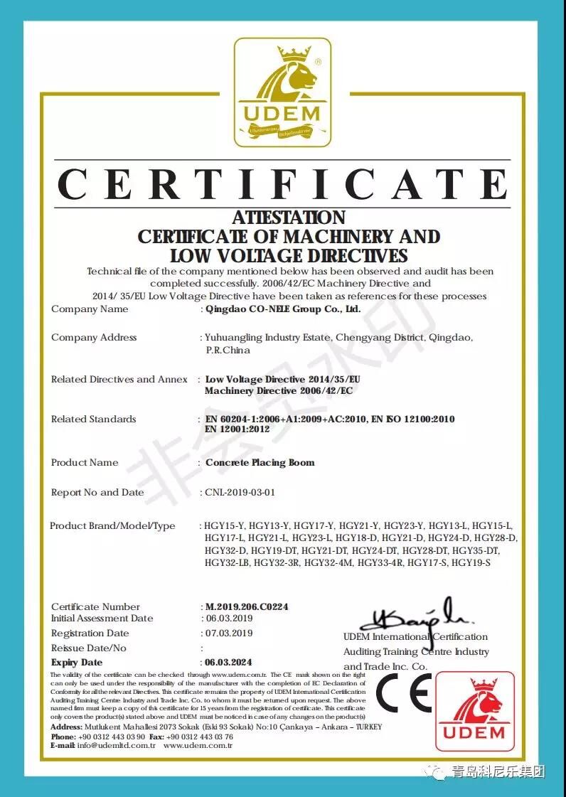 陽春三月,微風習習,科尼樂集團的明星產品混凝土泵、混凝土布料機順利通過了歐盟CE認證,這也代表著科尼樂集團在提升產品品質、拓展銷路、提升企業(yè)競爭力方面邁入了新臺階。