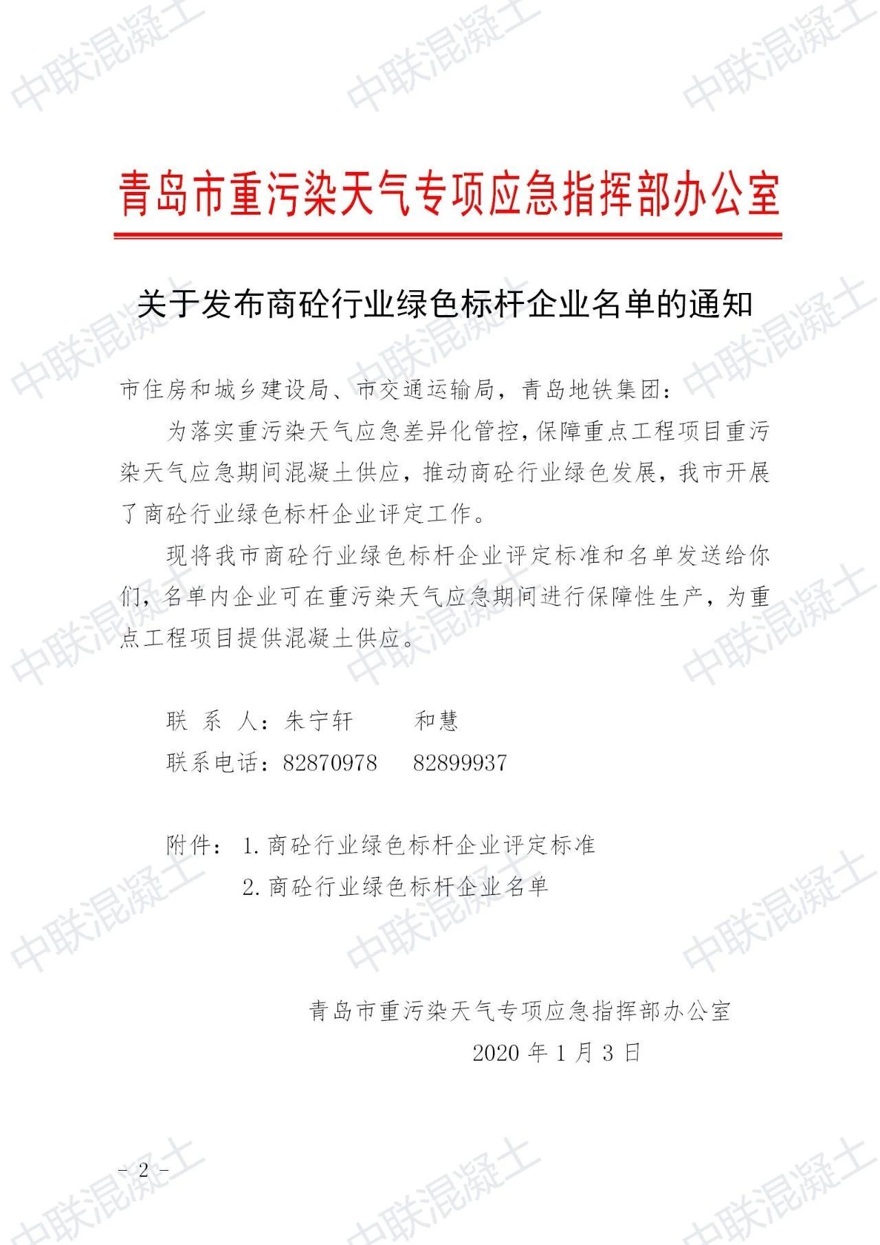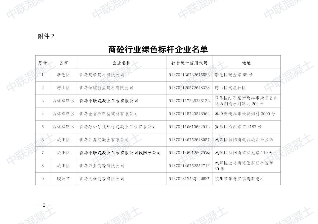 2020年1月3日,青島市重污染天氣專項應急指揮部辦公室發(fā)布商砼行業(yè)綠色標桿企業(yè)名單,全市170余家混凝土企業(yè)僅有15家通過評定,青島中聯(lián)混凝土和城陽分公司獨占2席。