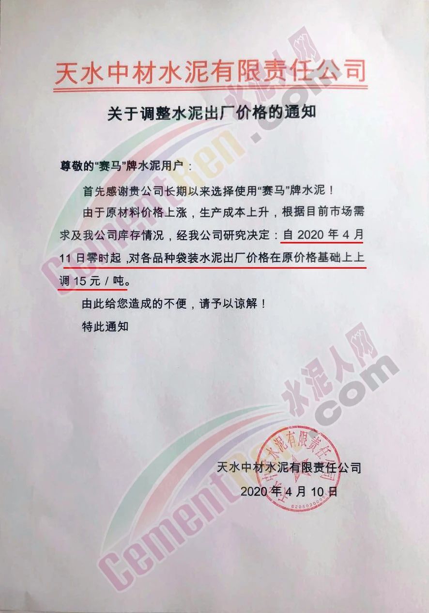 昨日(4月10日)天水中材水泥有限責(zé)任公司通知,由于原材料價格上漲,生產(chǎn)成本上升,根據(jù)目前市場需求公及公司庫存情況 ,經(jīng)公司研究決定自今日(4月11日)零時起,對各品種袋裝水泥出廠價格在原價格基礎(chǔ)上上調(diào)15元/噸。