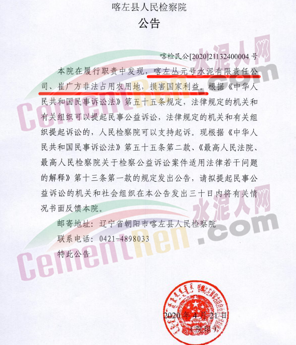 據(jù)了解,4月21日,遼寧省朝陽市喀左縣人民檢察院在履行職責中發(fā)現(xiàn),喀左叢元號水泥有限責任公司、崔廣方非法占用農(nóng)用地,損害國家利益。根據(jù)《中華人民共和國民事訴訟法》第五十五條規(guī)定,法律規(guī)定的機關和有關組織可以提起民事公益訴訟,法律規(guī)定的機關和有關組織提起訴訟的,人民檢察院可以支持起訴。