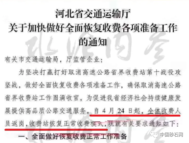 據(jù)中國砂石協(xié)會和中國砂石網(wǎng)了解,日前,河北省交通運輸廳發(fā)布《關(guān)于加快做好全面恢復(fù)收費各項準備工作的通知》稱為堅決打贏打好取消高速公路省界收費站第十戰(zhàn)役攻堅戰(zhàn),做好全面恢復(fù)收費各項準備工作,確保取消高速公路省界收費站工作圓滿收官,為促進全省經(jīng)濟社會持續(xù)健康發(fā)展提供高品質(zhì)公路交通服務(wù),自4月24日起,全體收費人員返崗,收費站恢復(fù)正常收費模式。
