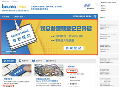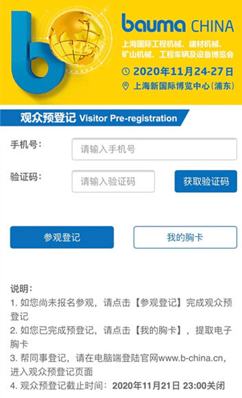 掃碼進(jìn)入預(yù)登記頁(yè)面,或登錄官網(wǎng)www.b-china.cn。中國(guó)港澳臺(tái)地區(qū)與海外觀眾,請(qǐng)登陸英文網(wǎng)站www.bauma-china.com進(jìn)行預(yù)登記。