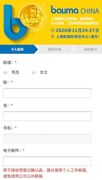 請(qǐng)按提示完整填寫(xiě)您的個(gè)人信息。為方便您后期接受預(yù)登記確認(rèn)函、為同事注冊(cè),請(qǐng)務(wù)必確認(rèn)手機(jī)、郵箱、姓名準(zhǔn)確填寫(xiě)。