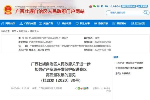 近日,廣西壯族自治區(qū)人民政府發(fā)布《關(guān)于進一步加強礦產(chǎn)資源開發(fā)保護促進我區(qū)高質(zhì)量發(fā)展的意見》,針對自治區(qū)礦業(yè)開發(fā)布局不合理、規(guī)?;讲桓?、粗放利用和生態(tài)環(huán)境保護不到位等問題提出若干建議,努力加強礦產(chǎn)資源開發(fā)保護,提高礦產(chǎn)資源有序開發(fā)和綜合利用水平。