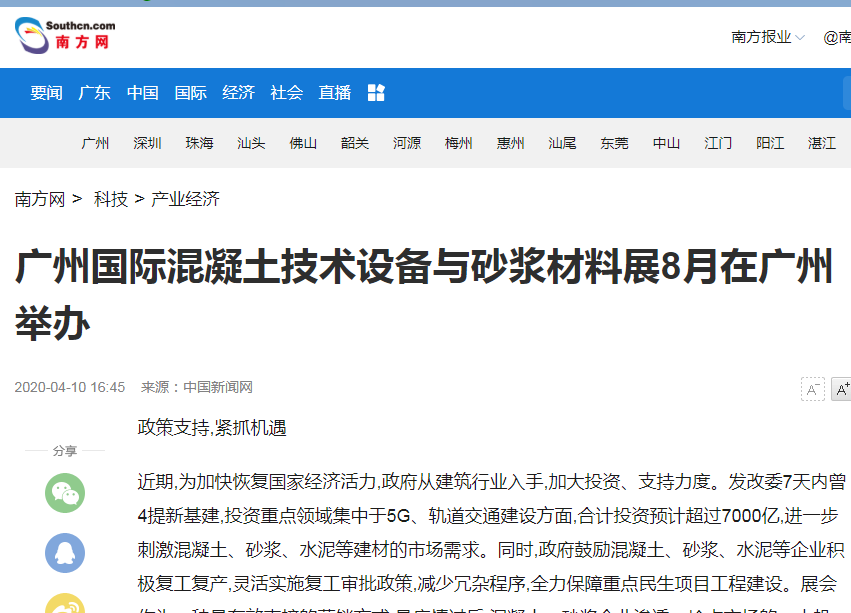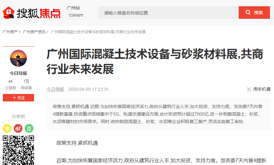 廣州國際混凝土及砂漿展已于2020年成功舉辦,自項(xiàng)目立項(xiàng)以來,得到多方媒體的關(guān)注和報(bào)道。據(jù)統(tǒng)計(jì),2020-2021年度,騰訊視頻、愛奇藝、土豆網(wǎng)、優(yōu)酷視頻等電視媒體,網(wǎng)易房產(chǎn)、新浪家居、廣州搜狐焦點(diǎn)、騰訊網(wǎng)、中國數(shù)字經(jīng)濟(jì)網(wǎng)、央廣網(wǎng)、360慧聰網(wǎng)、南方網(wǎng)、北方網(wǎng)、羊城晚報(bào)、廣州日?qǐng)?bào)、新浪網(wǎng)、新京報(bào)、21世紀(jì)經(jīng)濟(jì)報(bào)道、東方網(wǎng)、光明網(wǎng)、中國商業(yè)新聞網(wǎng)、焦點(diǎn)中國網(wǎng)等主流媒體,抖音、快手、西瓜視頻、今日頭條、百家號(hào)、火山小視頻等視頻媒體和廣東建設(shè)報(bào)、中國路面機(jī)械網(wǎng)、新型砂漿網(wǎng)、世界機(jī)械網(wǎng)、工程機(jī)械在線、攪拌設(shè)備網(wǎng)、中國保溫砂漿網(wǎng)等行業(yè)媒體,以及《混凝土雜志》、《砼時(shí)代》等雜志媒體均對(duì)展會(huì)給予高度關(guān)注,積極宣傳展會(huì)動(dòng)態(tài)與資訊。感謝各行業(yè)媒體、主流媒體、視頻媒體、雜志的大力支持與高度認(rèn)可。