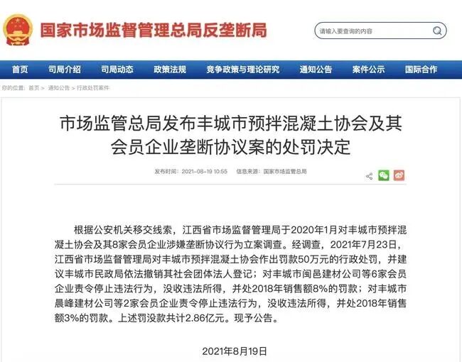 8月18日,國家市場監(jiān)管總局發(fā)布通報(bào),江西省市場監(jiān)督管理局對豐城市預(yù)拌混凝土協(xié)會及其會員企業(yè)壟斷協(xié)議一案,合計(jì)罰沒約2.86億元。
