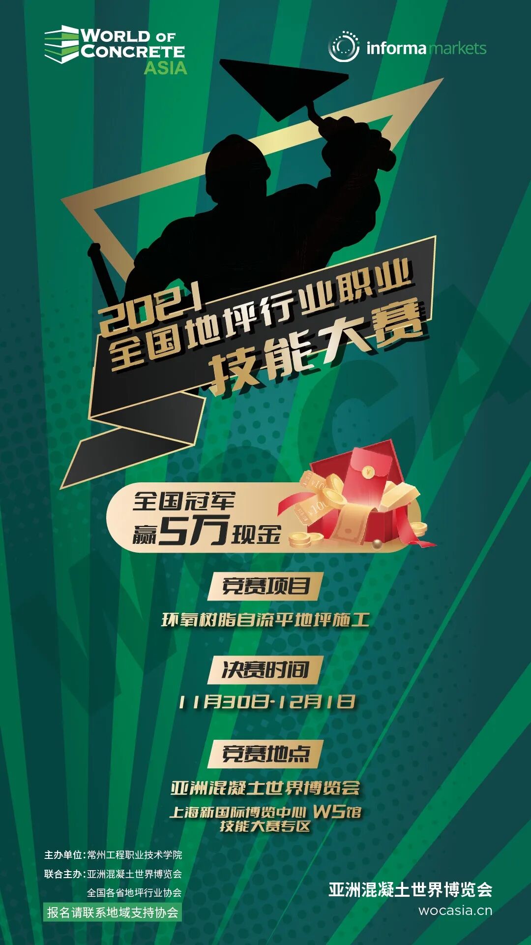 由常州工程職業(yè)技術(shù)學(xué)院、WOCA亞洲混凝土世界博覽會(huì)聯(lián)合主辦,地坪產(chǎn)業(yè)學(xué)院和各省地坪行業(yè)協(xié)會(huì)協(xié)辦的“2021年全國(guó)地坪行業(yè)職業(yè)技能大賽”,將在2021年亞洲混凝土世界博覽會(huì)展會(huì)現(xiàn)場(chǎng)舉行,全國(guó)冠軍將獲得五萬(wàn)現(xiàn)金!