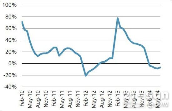 2014年上半年,商品房銷售面積累計(jì)下降6%,銷售額下降7%,房屋新開工面積累計(jì)同比下降16.5%;房屋施工面積累計(jì)同比增長11.3%,增速較2013年的16.1%明顯下降。展望2014年下半年,由于2013年下半年商品房銷售面積達(dá)7.9億平米,絕對水平較高,因此該行預(yù)計(jì)下半年銷售面積下降幅度有擴(kuò)大的可能,從而壓制開發(fā)商的房地產(chǎn)建設(shè)活動(dòng)。