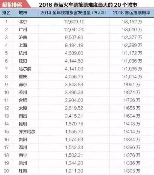 按照以上方法,標(biāo)準(zhǔn)排名在50個(gè)城市的數(shù)據(jù)基礎(chǔ)上,統(tǒng)計(jì)出了“2016春運(yùn)火車票搶票難度最大的20個(gè)城市”。其中,擁有大量外來人口的北京,當(dāng)仁不讓成為了出發(fā)地最難買票的城市;打工圣地廣州,位列第二;濟(jì)南作為人口大省山東的省會(huì),位列第三;上海和杭州緊隨其后,位列第四和第五;沈陽、哈爾濱、重慶、南京、蘇州、合肥、太原、南昌、昆明、齊齊哈爾、貴陽、溫州、南寧、常州和珠海分別進(jìn)入前20強(qiáng),入榜城市鐵路旅客發(fā)送量均超過1000萬人次。