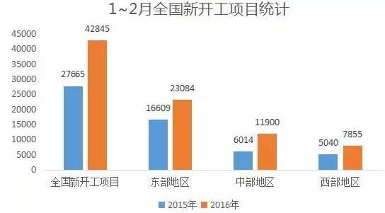今年1~2月,全國(guó)新開工項(xiàng)目42845個(gè),比去年增加15180個(gè)。其中,東部地區(qū)新開工項(xiàng)目23084個(gè),增加6475個(gè);中部地區(qū)新開工項(xiàng)目11900個(gè),增加5886個(gè);西部地區(qū)新開工項(xiàng)目7855個(gè),增加2815個(gè)。