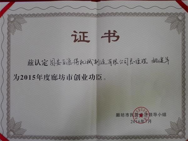 近日,固安百濾得機(jī)械制造有限公司總經(jīng)理姚建軍榮獲廊坊市創(chuàng)業(yè)功臣獎(jiǎng),獎(jiǎng)金十萬(wàn)元整,也正是如此,更加說(shuō)明市場(chǎng)對(duì)百濾得的認(rèn)可,百濾得對(duì)市場(chǎng)的優(yōu)質(zhì)服務(wù)。