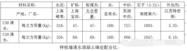 最終,第四段樣板墻實(shí)踐完成后,根據(jù)業(yè)主、監(jiān)理、設(shè)計(jì)等各方的意見最終明確正式清水混凝土施工的配合比: