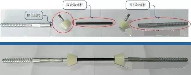 根據(jù)對(duì)日本已完清水混凝土工程考察結(jié)果,日方在施工中均采用三接頭的對(duì)拉螺桿,施工中有效解決了螺桿眼部位的失水漏漿的問題,有效避免了熊貓眼的發(fā)生。為了有效保護(hù)清水模板的表面,通過多輪試驗(yàn)對(duì)比,特別研制出了五段式對(duì)拉螺桿。