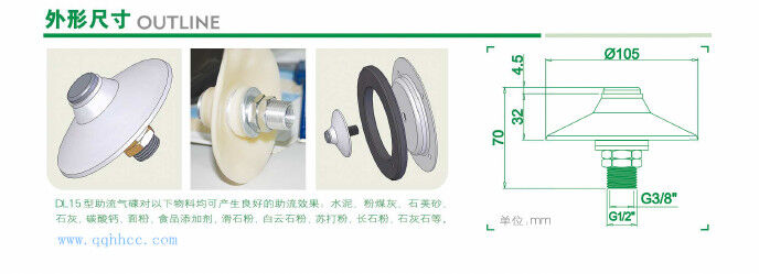 助流氣蝶前部是多孔金屬,外部通入的高壓空氣,經(jīng)過氣嘴后均勻分散在氣嘴周圍,促使粉料流動,達到助流效果。流化效果由氣嘴數(shù)量確定,不同的粉料及容器狀況需要不同數(shù)量的氣嘴。本產(chǎn)品具有安裝維護方便,價格低廉、流化效果明顯等突出優(yōu)點。 是水泥倉頂除塵器,攪拌站倉頂除塵器,以及水泥罐倉頂除塵器重要元件。