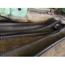 大傾角擋邊輸送帶的基帶是由上覆蓋膠、下覆蓋膠、帶芯和橫向剛性層四部分組成。上覆蓋膠厚度一般為3-6mm;下覆蓋膠厚度一般為1.5-4.5mm,帶芯材料承受拉力,其材料可以是棉帆布(CC)、尼龍帆布(NN)、聚酯帆布(EP)或鋼繩芯(ST)。為了增加基帶的橫行剛性,在芯體上下添加特殊加強(qiáng)層,稱橫向剛性層。基帶的寬度規(guī)格,與普通膠帶相同,符合GB7984-2001的標(biāo)準(zhǔn)規(guī)定。