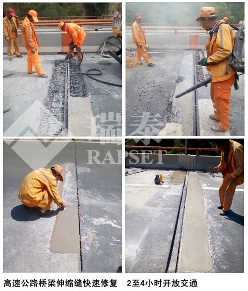 養(yǎng)護人員到達現(xiàn)場,對破損混凝土進行鑿除,將伸縮縫內(nèi)部斷裂的鋼筋電焊連接好,然后將搶修寶材料按照一定的水灰比攪拌均勻,澆筑于伸縮縫坑槽內(nèi),用振搗棒進行適當(dāng)振搗,然后迅速收面,初凝后,開始灑水養(yǎng)生,2小時后,完全可以通行。目前,所有路段均已施工修復(fù)完畢。產(chǎn)品品質(zhì)以及材料實用性獲得了局領(lǐng)導(dǎo)以及養(yǎng)護工人的一致好評。