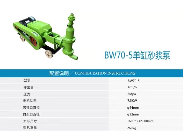 BW70-5型單缸砂漿泵是一種臥式單缸往復單作用式活塞泵,主要用于道路、橋梁、水壩、國防、礦山等建筑工程的注漿施工;也可用于預(yù)應(yīng)力構(gòu)件工程的灰漿注入擴張;火力發(fā)電廠的煤粉灰漿輸送;建筑工程中灰漿的垂直及水平輸送;化工部門中用于輸送漿狀原料(色漿、涂料)、磁性材料和其它介質(zhì);沙土地、高爐、水泥路面、高速公路等工程的維護、修固等,具有結(jié)構(gòu)緊湊、密封性好、壓力大、活塞更換方便、裝配及維修簡單等優(yōu)點。單缸砂漿泵可泵沙漿,砂粒應(yīng)過篩,較大粒徑不大于5mm。砂粒粒徑1mm以下的砂質(zhì)量占總砂量的60%以上,注漿中不得混入石子及其它雜物(如;鐵釘、草木等),應(yīng)為拌合均勻的勻質(zhì)灰漿,不得有干砂及硬塊,稠度值為不小于8cm,稠度計重300g。