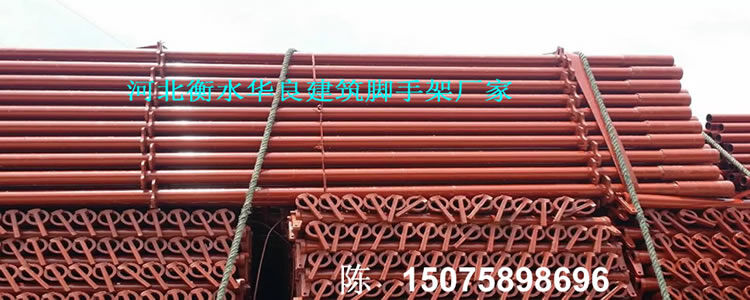 河北衡水華良建筑器材聯(lián)系電話:150-7589-8696 ,輪扣腳手架、碗扣腳手架、快拆式腳手架、承插式新型腳手架、直插式腳手架、鋼管腳手架、建筑腳手架,新型建筑支撐,腳手架,模板支撐,新型模板支撐, 新型建筑支撐。這種新型材料的特點(diǎn)是:耐腐蝕,彈性大,堅(jiān)固不變形。易搭拆腳手架,施工速度快的腳手架。 每根支撐桿可以支撐3-4噸左右,兩根主龍脊之間可以承重2-2.5噸的重量,每根副龍脊可以承重1噸。現(xiàn)在工地現(xiàn)澆水泥一般厚度也就是10-15厘米,同等面積重量最多100-150公斤,所以這個(gè)支撐力度一般高層建筑完全夠用。