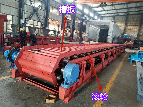板式給料機運行部件由牽引鏈條,承載構(gòu)件行走滾輪和輸送槽板等組成。