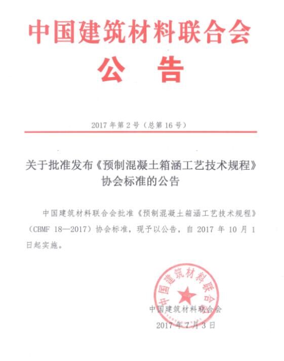 2017年7月,由中國混凝土與水泥制品協(xié)會(以下簡稱協(xié)會)組織制定的《預(yù)制混凝土箱涵工藝技術(shù)規(guī)程》和《混凝土用氧化鎂膨脹劑》兩項協(xié)會標(biāo)準,通過審定并發(fā)布批準公告,標(biāo)準號分別為CBMF 18-2017和CBMF 19-2017,將同時于2017年10月1日起實施。這是國務(wù)院《深化標(biāo)準化工作改革方案》(國發(fā)[2015]13號)及質(zhì)檢總局、國家標(biāo)準委《關(guān)于培育和發(fā)展團體標(biāo)準的指導(dǎo)意見》(國質(zhì)檢標(biāo)聯(lián)[2016]109號)發(fā)布后,協(xié)會與中國建筑材料聯(lián)合會(以下簡稱聯(lián)合會)聯(lián)合發(fā)布的首批協(xié)會標(biāo)準,兩項標(biāo)準將公開出版并發(fā)行。