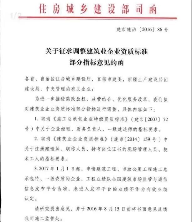 近日,住房和城鄉(xiāng)建設(shè)部建筑市場監(jiān)管司就“調(diào)整建筑業(yè)企業(yè)資質(zhì)標(biāo)準(zhǔn)部分指標(biāo)”征求意見(建市施函[2016]86號),主要內(nèi)容有以下兩點(diǎn):
